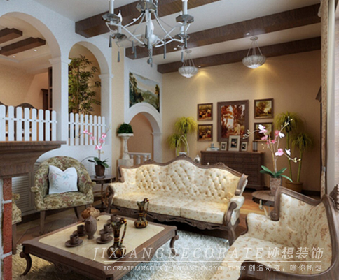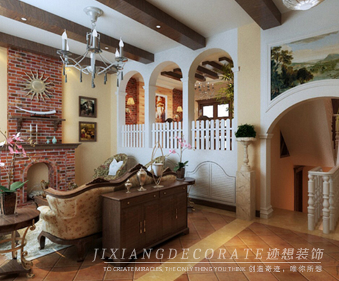 本案例整體采用了美式鄉村的裝修風格,大量采用了壁爐,拱形,紅磚等經典元素,搭以碎花窗簾,油畫作為點綴。