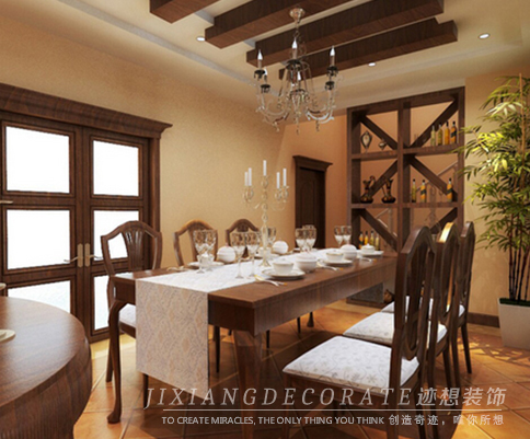 餐廳與客廳在 吊頂,掛畫處相互呼應,紅磚墻面,實木家具顯出濃濃的沒是鄉村風格;